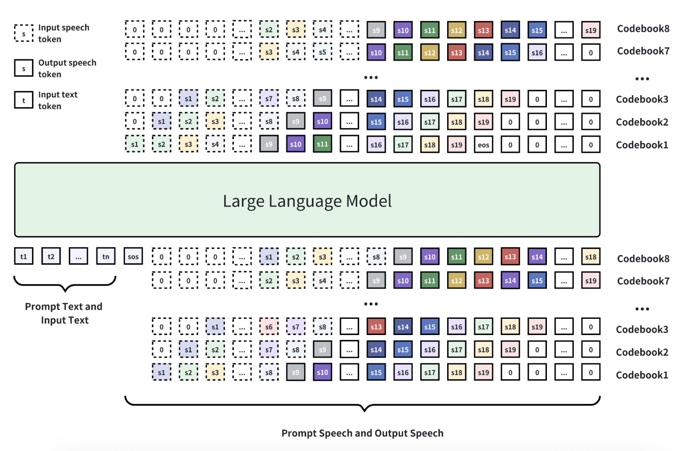受 MusicGen 和 VOICECRAFT 的启发,MOSS-TTSD 采用 自回归建模 结合 多头 Delay 的方式生成语音 token。这种方法能够有效捕捉对话中的长期依赖关系,确保语音在韵律、语调和风格上的连贯性。