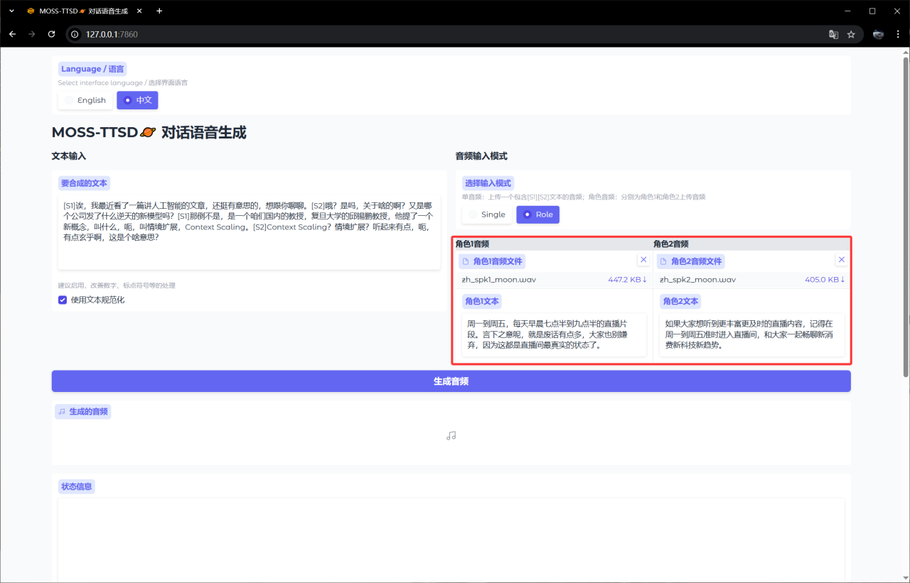 第二种则是,分别上传不同角色的音频,分别输入不同角色的说话内容,在合成的文本中,实现的对话式的合成文本内容即可,也是用[S1] [S2] 分别代表两个人的说话内容