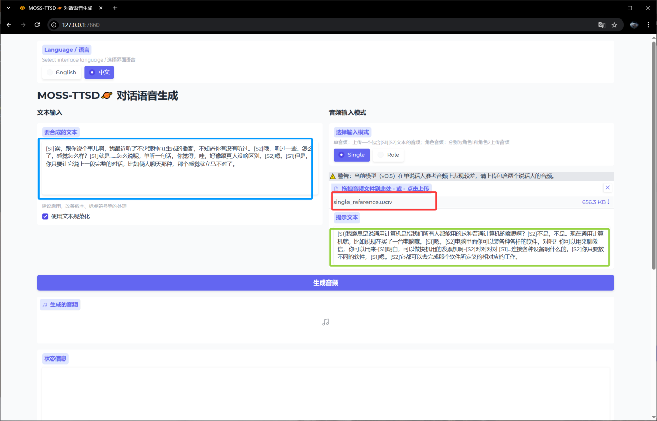 第一种是单音频方式,音频中包含两个说话人的音频,用[S1] [S2] 分别代表两个人的说话内容,填写到提示文本中。然后在要合成的文本中,也是使用这种方式,来进行文本To音频克隆的转换。